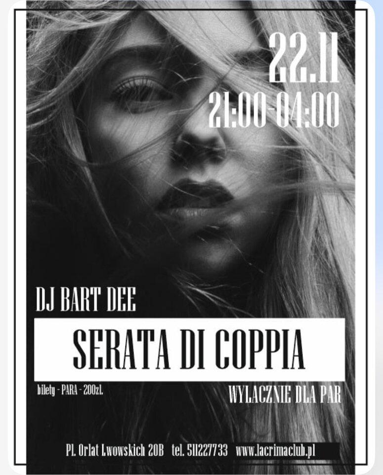 SERATA DI COPPIA (Event bez konieczności rezerwacji) Zamknijcie drzwi sypialni… i otwórzcie się na coś więcej. Nadszedł czas na kolejną imprezę TYLKO DLA PAR w naszym klubie – bo kto powiedział, że wieczory we dwoje muszą kończyć się we dwoje? Jeśli lubicie grzeszne spojrzenia, śmiałe rozmowy i ręce, które zbaczają z kursu… to dobrze trafiliście. Nie będzie karaoke, nie będzie tortu – ale gwarantujemy, że napięcie da się kroić nożem, a niektórzy może nawet zgubią więcej niż tylko głowę. Za konsolą, znany i lubiany przez Was - DJ Bart Dee Dreesscode - ELEGANCJA, fetysz, erotyka bilet para – 200zł godz 21:00-04:00 BUTELKA PROSECCO DLA PIERWSZYCH W PLAYROOMACH - tradycja Lacrima Jak zawsze prosecco, kawa, przekąski, woda dla naszych gośći - GRATIS Magda&Marcin