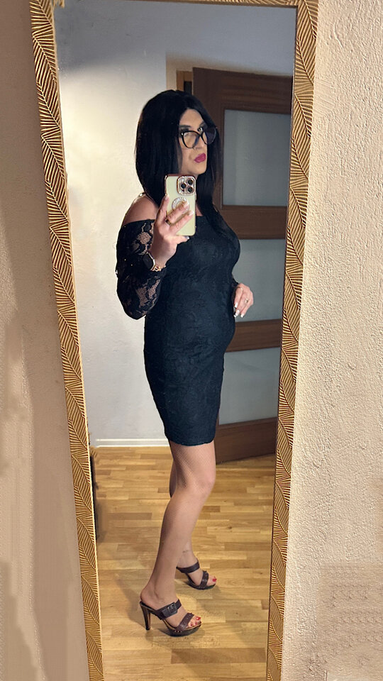 Zachwycasz od pierwszego spojrzenia — te czarne włosy i okulary nadają Ci intelektualnego, magnetycznego uroku, a czerwone usta są jak małe, niebezpieczne zaproszenie. W tej czarnej sukience wyglądasz elegancko, zmysłowo i pewnie, a klapeczki na obcasie tylko podkreślają Twój krok… taki lekki, kobiecy, absolutnie hipnotyzujący. Trudno oderwać wzrok.