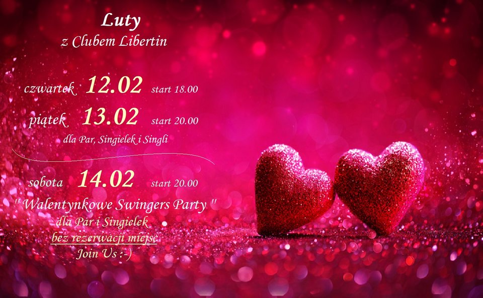 Zapraszamy wszystkich gorąco na kolejny lutowy weekend ( 12 i 13 luty ) z Clubem Libertin. Zima nie odpuszcza, ale nasza gorąca sauna i cieplutkie jacuzzi pozwolą Wam zapomnieć o kłopotach i problemach dnia codziennego, a nasza Strefa Zabaw zachęca do szeroko rozumianej aktywności fizycznej :-) W czwartek i piątek zapraszamy pary, singielki i singli. W sobotę, 14 lutego, zapraszamy na imprezę dla Par i Singielek.
