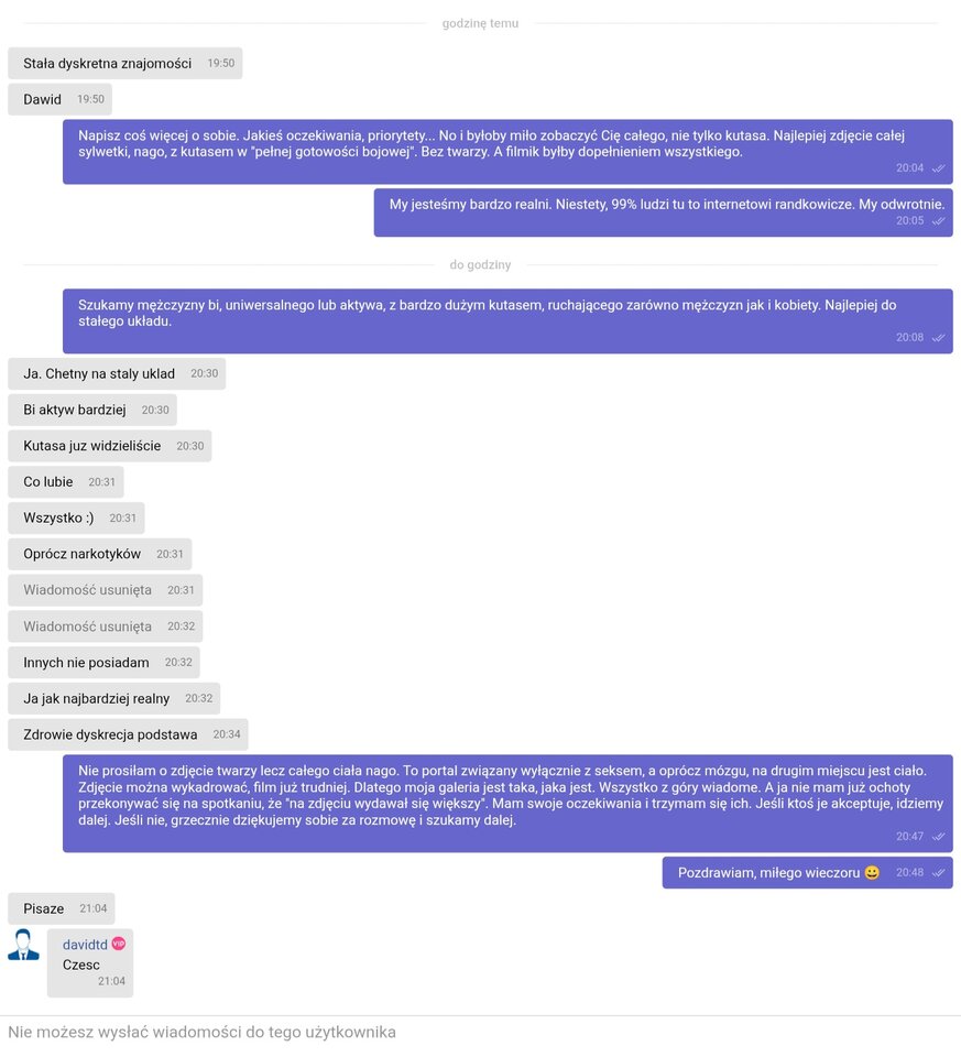 Kolejny Casanova z mlecznego baru... Czy tak trudno zrozumieć, że każdy ma swoje oczekiwania? Ja też mam swoje. Dlaczego mam wierzyć na słowo? Dlaczego mam być nieświadoma tego, co mnie czeka na "randce"? Ja chcę wiedzieć, bo mam jakieś priorytety, które są dla mnie ważne. Nie chcę zadowalać się ochłapami. Stawiam sprawę jasno, np.: lubię kolor biały. Więc jeśli masz kolor biały, pokaż go. A jeśli nie, nie proponuj mi pomarańczowego, bo taki mi się nie podoba. Czy tak trudno to zrozumieć? No i oczywiście blok, bo gówniarz boi się konfrontacji...