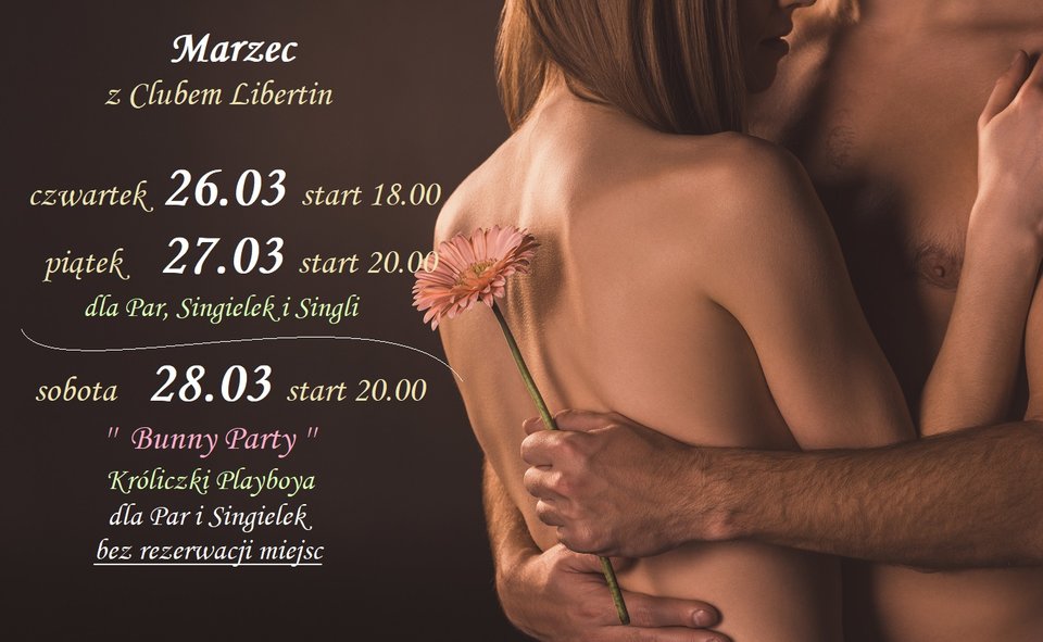 Zapraszamy wszystkich gorąco na kolejny weekend ( 26 i 27 marzec ) z Clubem Libertin. Wiosna coraz bliżej, ale w chłodne dni nasza gorąca sauna i cieplutkie jacuzzi pozwolą Wam zapomnieć o kłopotach i problemach dnia codziennego, a nasza Strefa Zabaw zachęca do szeroko rozumianej aktywności fizycznej :-) W czwartek i piątek zapraszamy pary, singielki i singli. W sobotę, 28 marca, zapraszamy na imprezę dla Par i Singielek.
